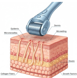 Microneedling is a minimally invasive skin treatment that uses fine needles to create controlled micro-injuries in the skin. This process stimulates the body’s natural healing response, boosting collagen and elastin production.