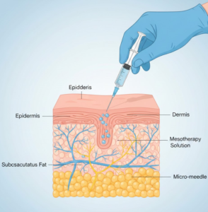 Mesotherapy involves the micro-injection of vitamins, minerals, enzymes, and hyaluronic acid into the skin to nourish, hydrate, and rejuvenate from within.